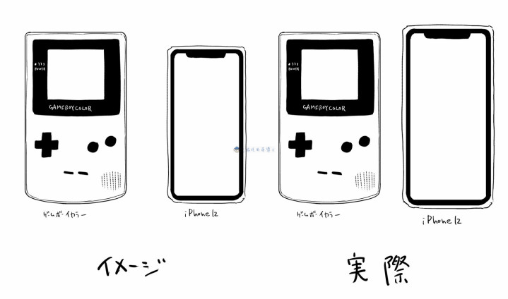 配图中,左边是“ahiru353”的印象回忆,Game Boy系列掌机应该是蛮大一台的,当年双手才能掌控,比目前使用的iPhone 12大上一圈才对;而右边则是实际大小对比,两台大小差不多,只有厚度有差距。单看长度的话,原来iPhone 12更长些,屏幕前的你是不是也挺惊讶的呢?
